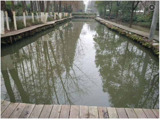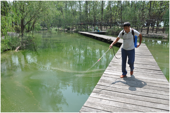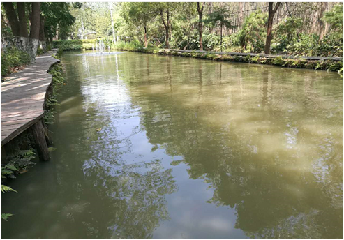 1號水域:位于焦姥路北,翠隱洞天東,長130米,均寬8米水域,面積1.62畝,1號水域相對獨(dú)立,補(bǔ)水由噴泉引地下水補(bǔ)充,水深1.5米,水體發(fā)黑,富營養(yǎng)化嚴(yán)重,透明度低;