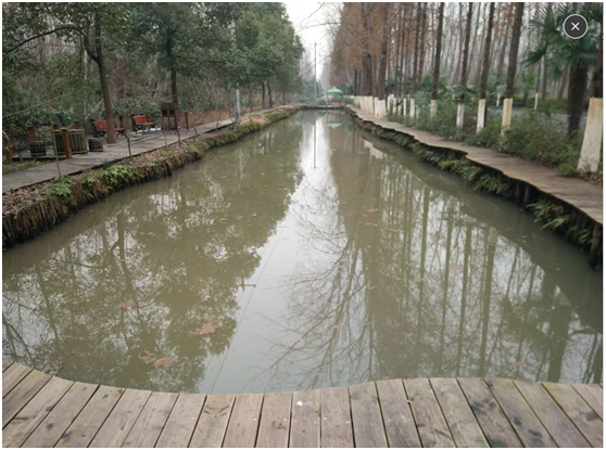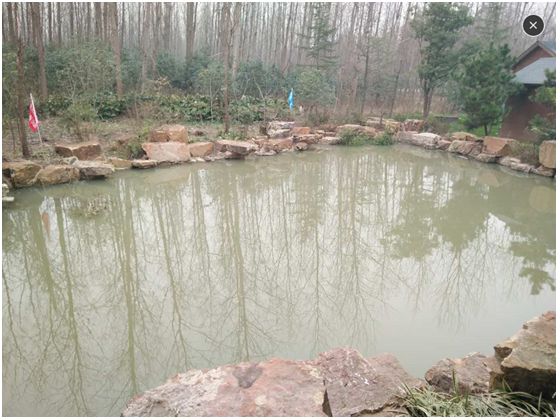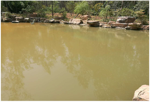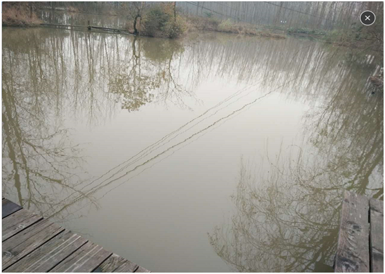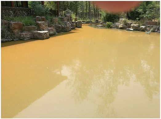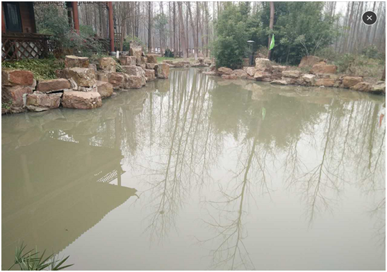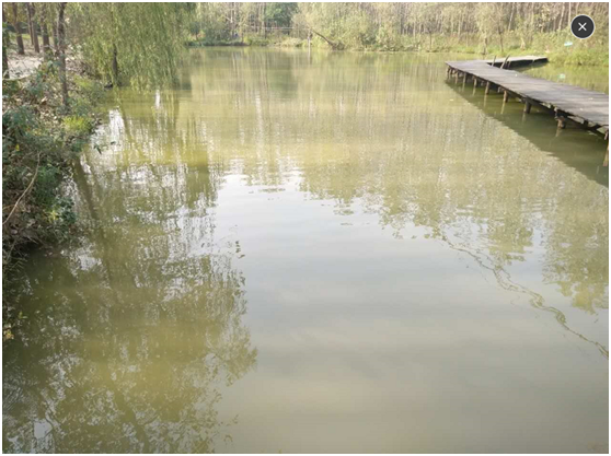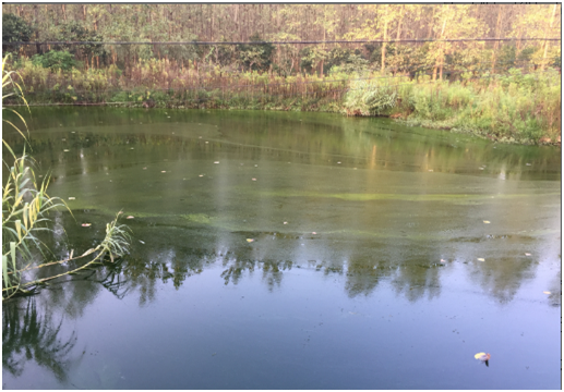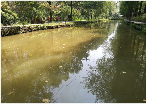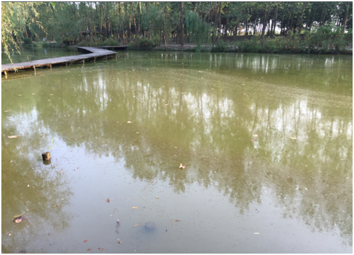 2號水域:位于茗舍聽見附近,水域相對獨(dú)立,面積0.84畝,水深1.5米,水面飄浮厚厚的藻類水華,水生態(tài)嚴(yán)重缺失,水色呈黃色,補(bǔ)水由地下水補(bǔ)充;
