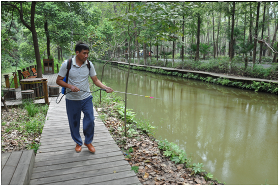 3號水域: 位于彩林站附近,水域與其他水域連通,水流量較小,水深1.5米,長100米,均寬20米,面積9.94畝。污染嚴(yán)重,水生態(tài)缺失,水色呈深綠色,透明度極低,水面飄浮大量油狀水華物質(zhì)。