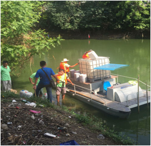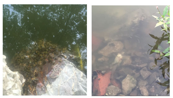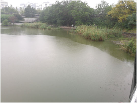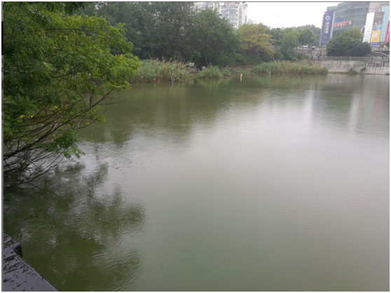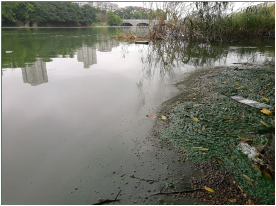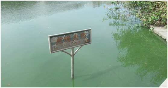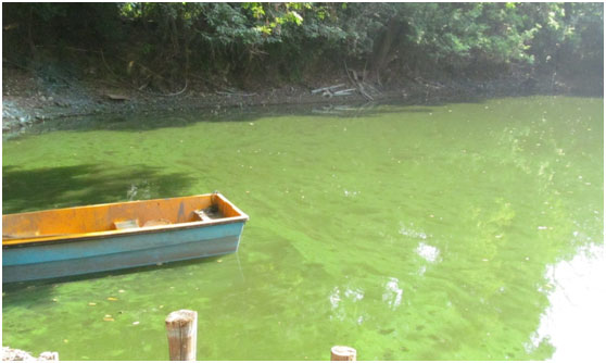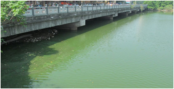 西河入水口,入水中含大量藍(lán)藻(水呈綠色)