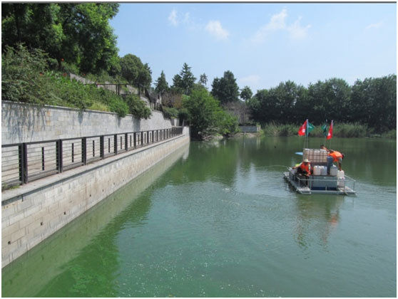 護(hù)城河?xùn)|河藍(lán)藻持續(xù)生長(zhǎng)爆發(fā),大量藍(lán)藻聚積在西河入口,隨水而下流入西河,加劇西河藍(lán)藻水華形成,對(duì)西河水域造成藍(lán)藻反復(fù)富集現(xiàn)象。