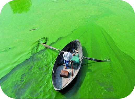 ? ? ? ? ? ? ? ? ? -藍(lán)藻(藍(lán)細(xì)菌)是“制氧菌”,喜歡靠陽光和水里的無機(jī)鹽(像化肥)瘋狂繁殖,形成水華。