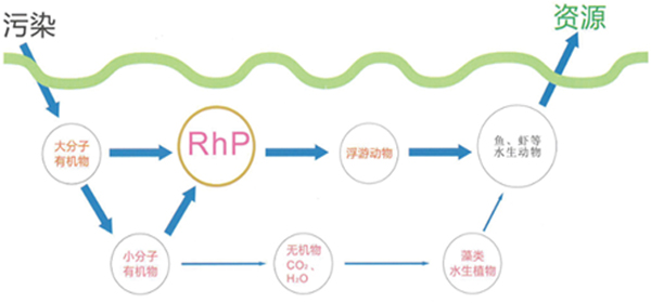 上圖中食物網(wǎng)關系可知,水體中的污染物首先RhP菌分解、吸收。隨后RhP被浮游動物攝食,最終轉(zhuǎn)移到魚蝦等水生動物體內(nèi)。也就是說,水體中曾經(jīng)的污染物質(zhì)——氮、磷、鉀等最終成了工程魚身體中的營養(yǎng)物質(zhì)。這就是RhP技術的神奇之處。